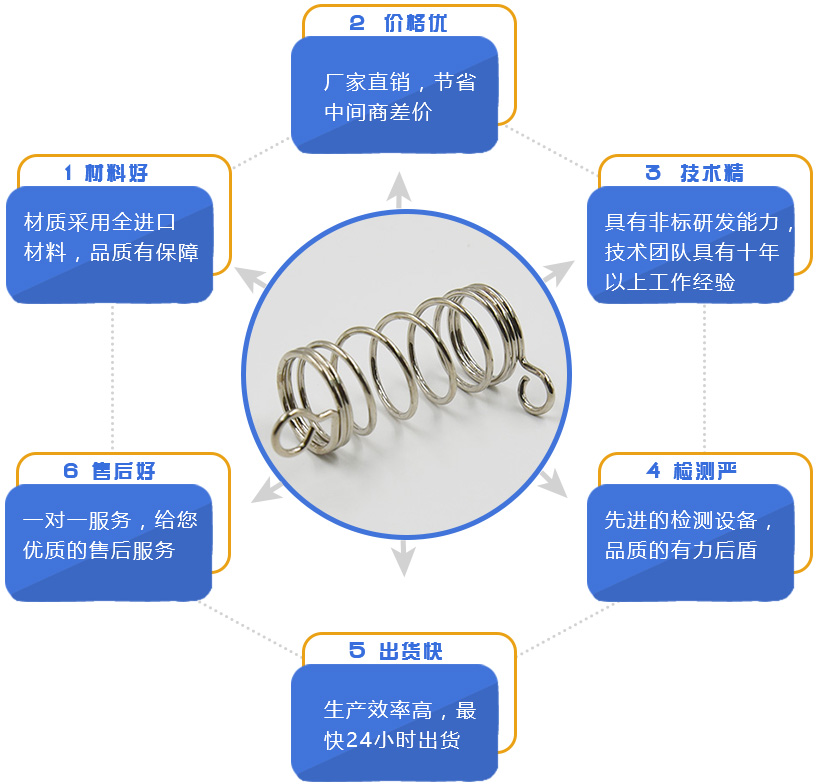 | 不銹鋼絲 (sus) | 有磁、無磁、光面和霧面 (樹脂面、暗面) | 201、202…… | 含鎳量少,達不到鹽霧測試 要求。 | 工藝彈簧多用此材料 |